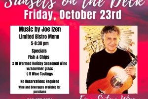 Enjoy a warm Holiday Seasoned wine while you listen to music and watch the sun set for the final Sunset on the Deck of the season. Special: Fish & Chips. Music by singer/guitarist and songwriter, Joe Izen.