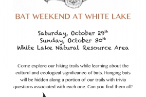 Come explore White Lake's hiking trails while learning about the cultural and ecological significance of bats, 11 a.m. to 2 p.m. on both weekend days. Hanging bats will be hidden along a portion of the trails with trivia questions associated with each one. Can you find them all?